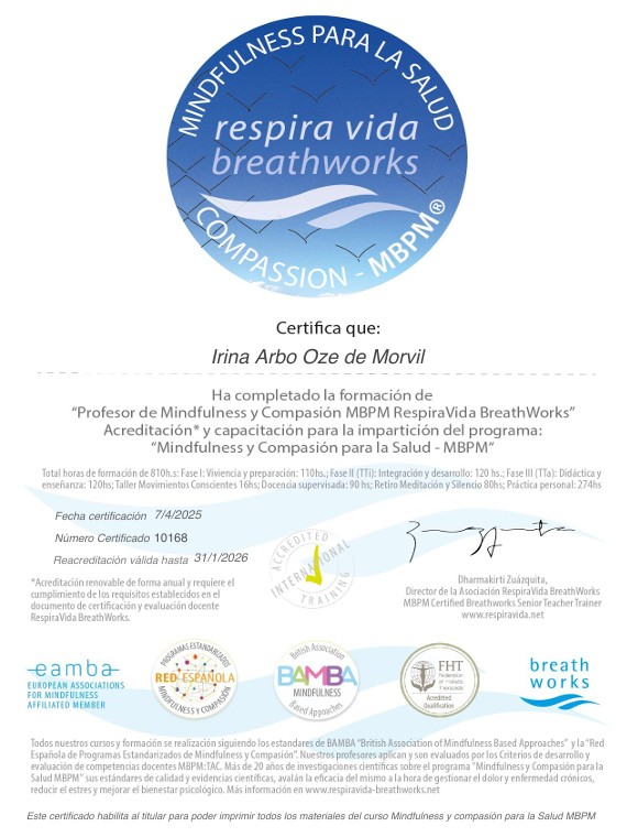 Tras años de formarme y certificarme (podés ver mis certificaciones más abajo) hoy me dedico a enseñar; pero no enseño lo que “dicen por ahí que es el Mindfulness”, sino lo que hizo el Mindfulness por mí.